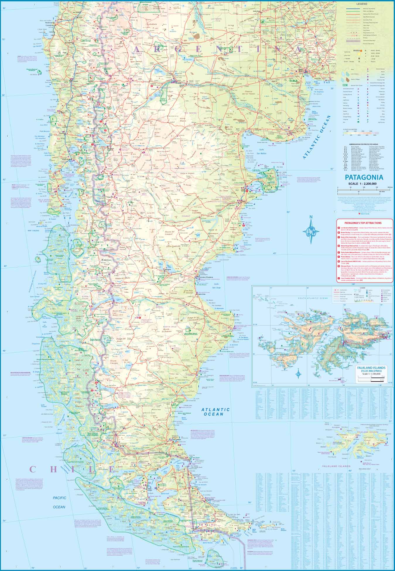 The Chile South & Patagonia Map is enhanced by including a set of ‘must see’ destinations and by the addition of three inset maps: Easter Island (Chile); Ushuaia (Argentina), and the Falkland Islands (UK).