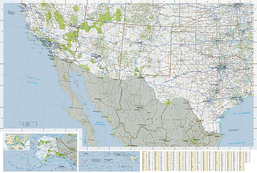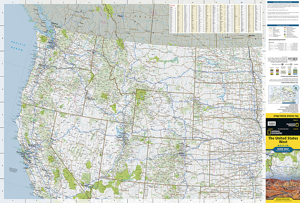 The United States West Guide Map is a detailed map of the Western United States highlighting the Dakotas, Texas, the Pacific Northwest, California, the Rocky Mountains, and the Desert Southwest, capturing the breadth and diversity of the region with clarity and depth. It clearly displays freeways, tollways, primary and secondary highways, making route planning easy whether you’re crossing state lines or exploring back roads. Towns are clearly labeled and supported by a convenient town index, so finding your way—near or far—is always straightforward.